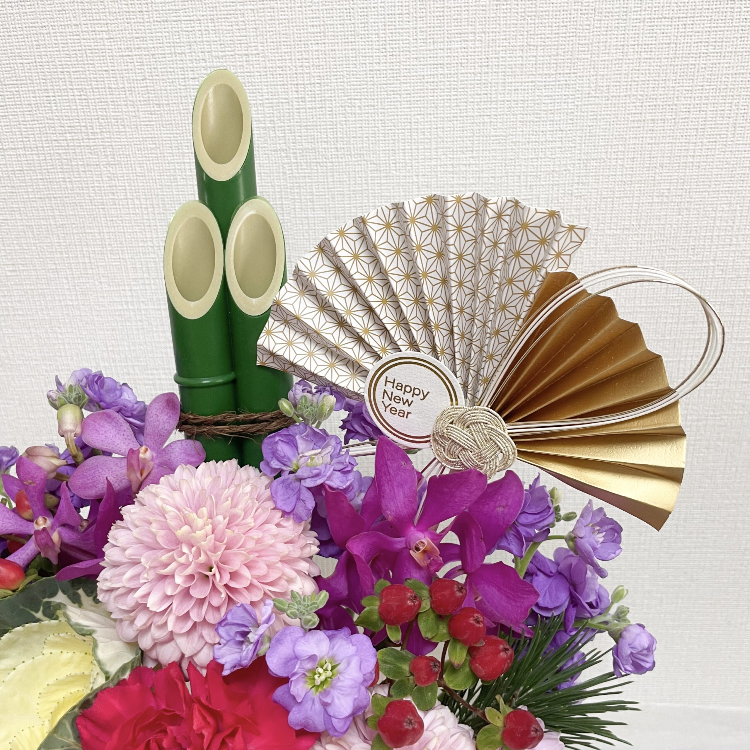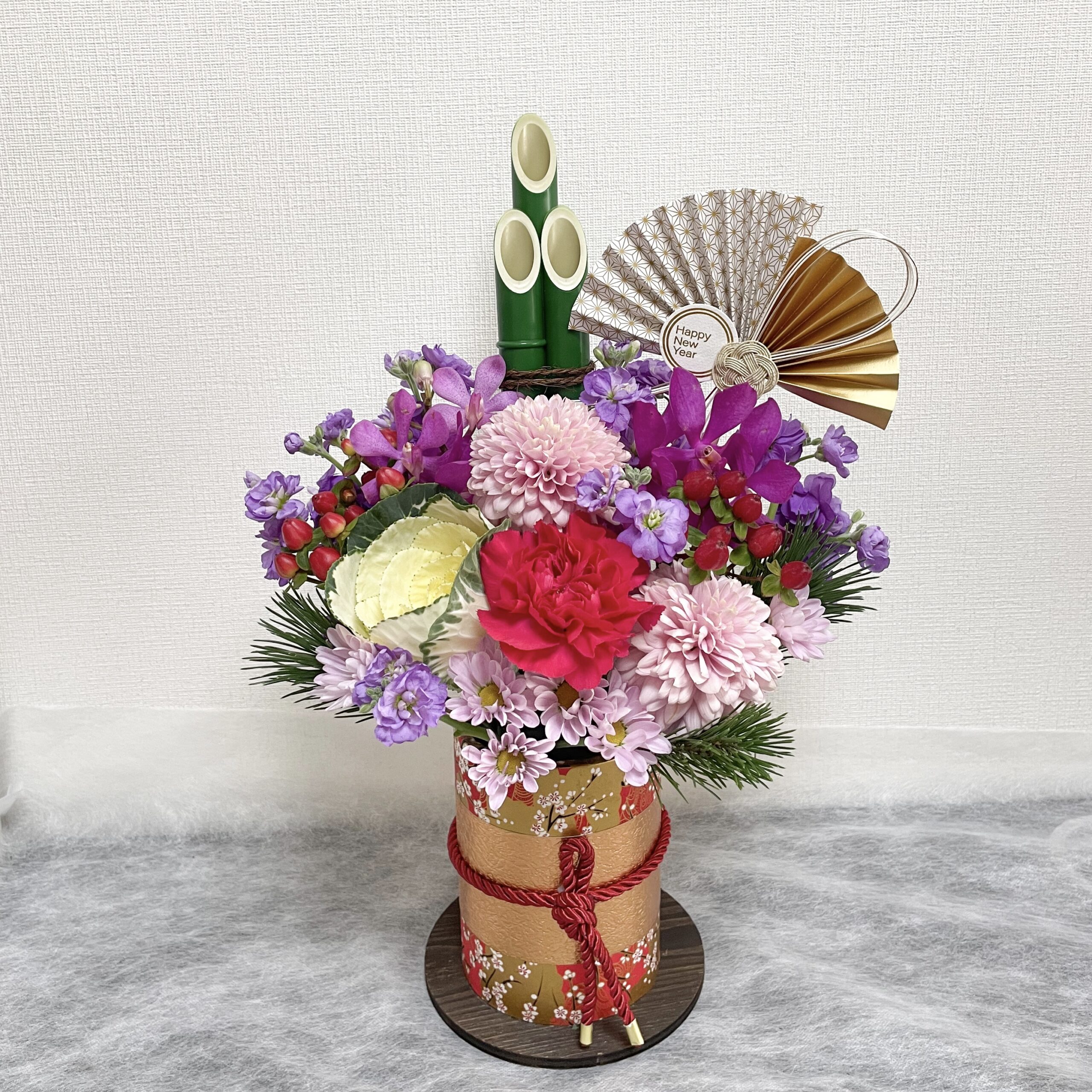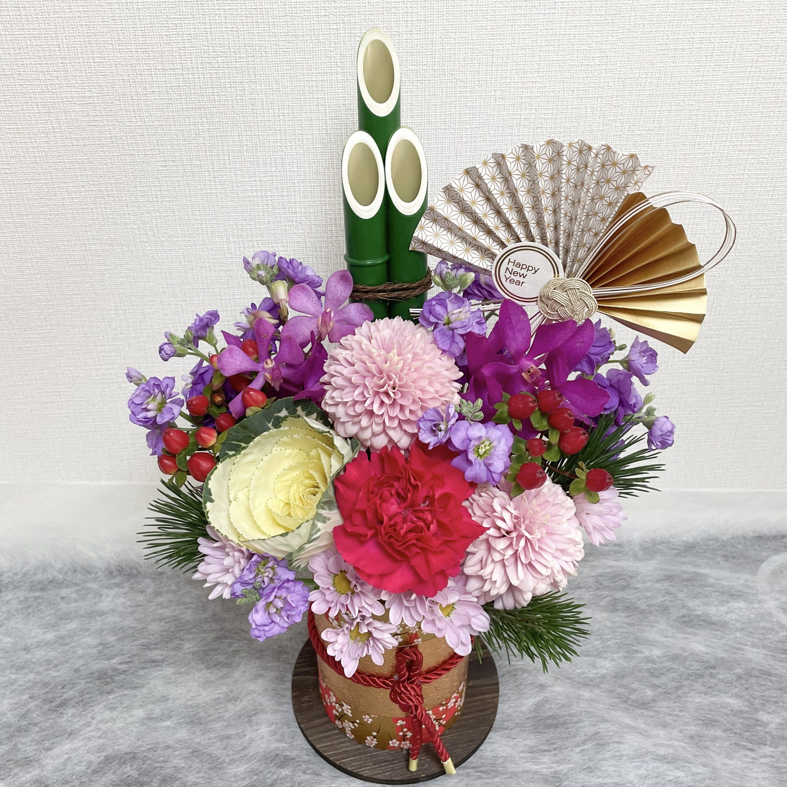 花材:葉牡丹、ディスバット、ストック、スプレーマム、モカラ、ヒペリカム、松、竹、扇ピック